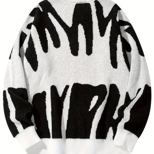 2024 Spring New Trendy Men’s Sweater, Round Neck Loose Fit Student Pullover Drop Shoulder Knit Sweater, Color Block Gray Personality Top