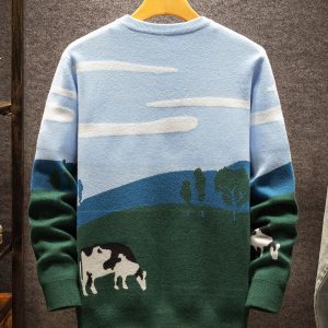 Cozy Fall | Cozy Fall Cow Print Sweater for Men – Casual Long Sleeve, Thick Knit, Acrylic, Crew Neck, Green & Blue Design with Black and White Cow, Perfect for Fallu002FWinter, Fall Winter Apparel | Playful Design | Acrylic Knitwear
