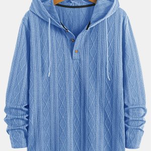 Men’s Fashion Classic Solid Color Stretch Knit Textured Jacquard Geometric Wheat Pattern Collar 3u002F1 Button Open Cardigan Design Long Sleeve Hooded Sweatshirt, Suitable for Daily Casual, Simple Outings, Commuting, Street Fashion, Essential Long Sleeve