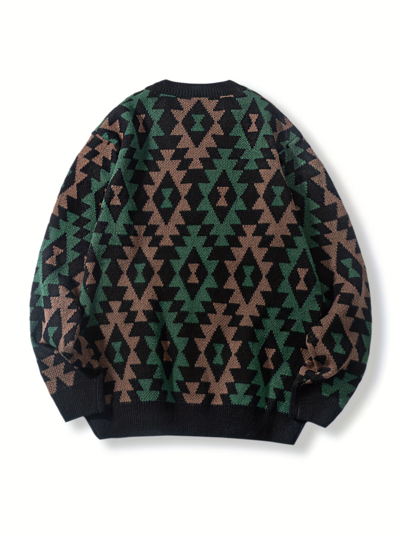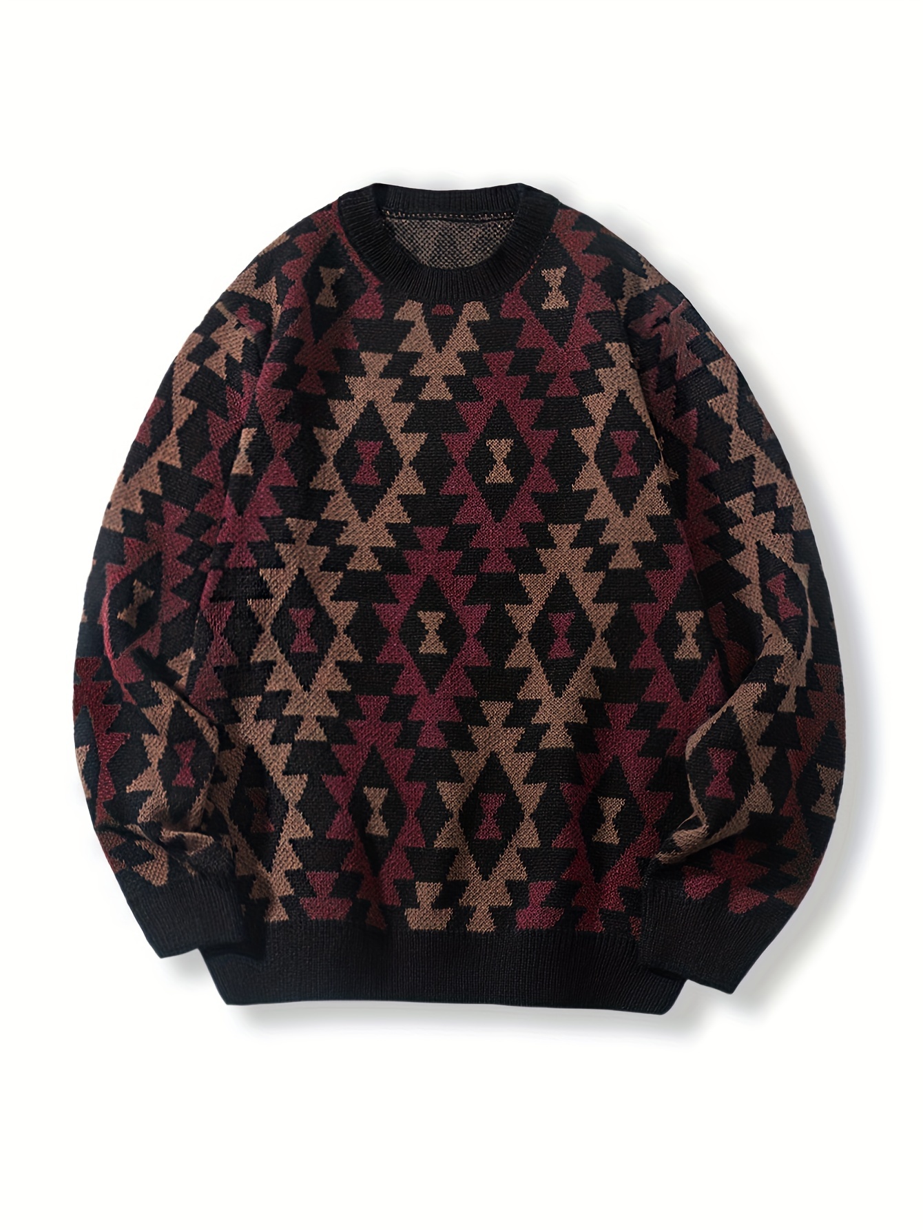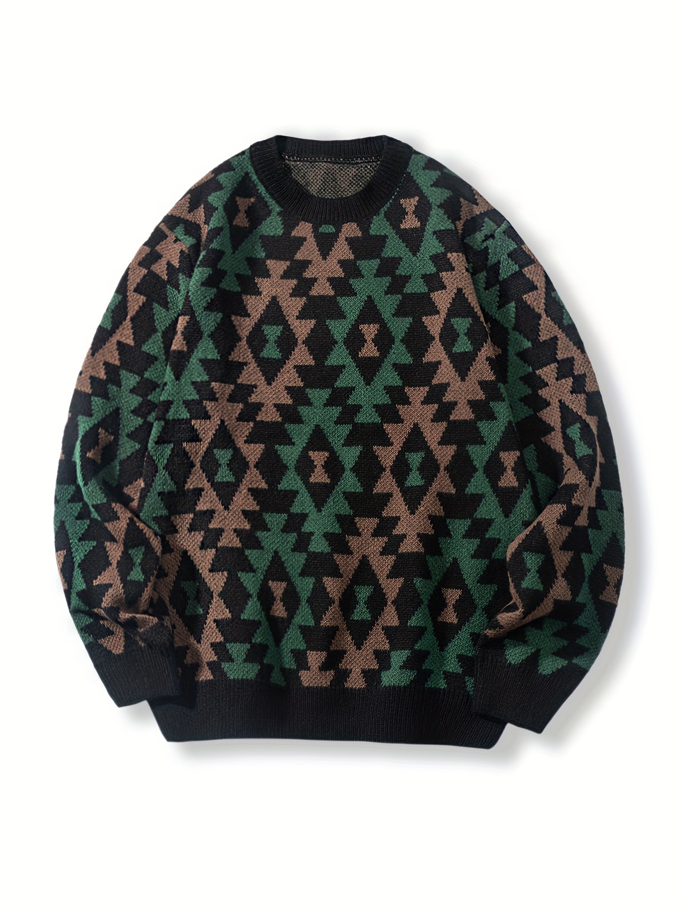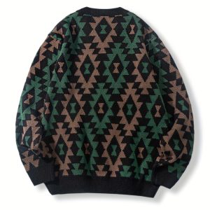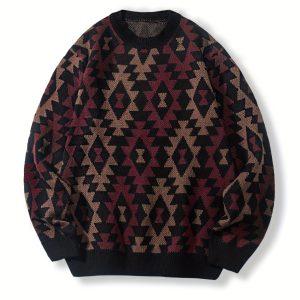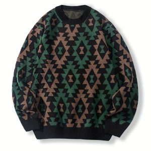 Geometric Pattern Design Men’s Casual Crew Neck Long Sleeve Knitted Pullover Sweater For Outdoor Casual, Autumn And Winter