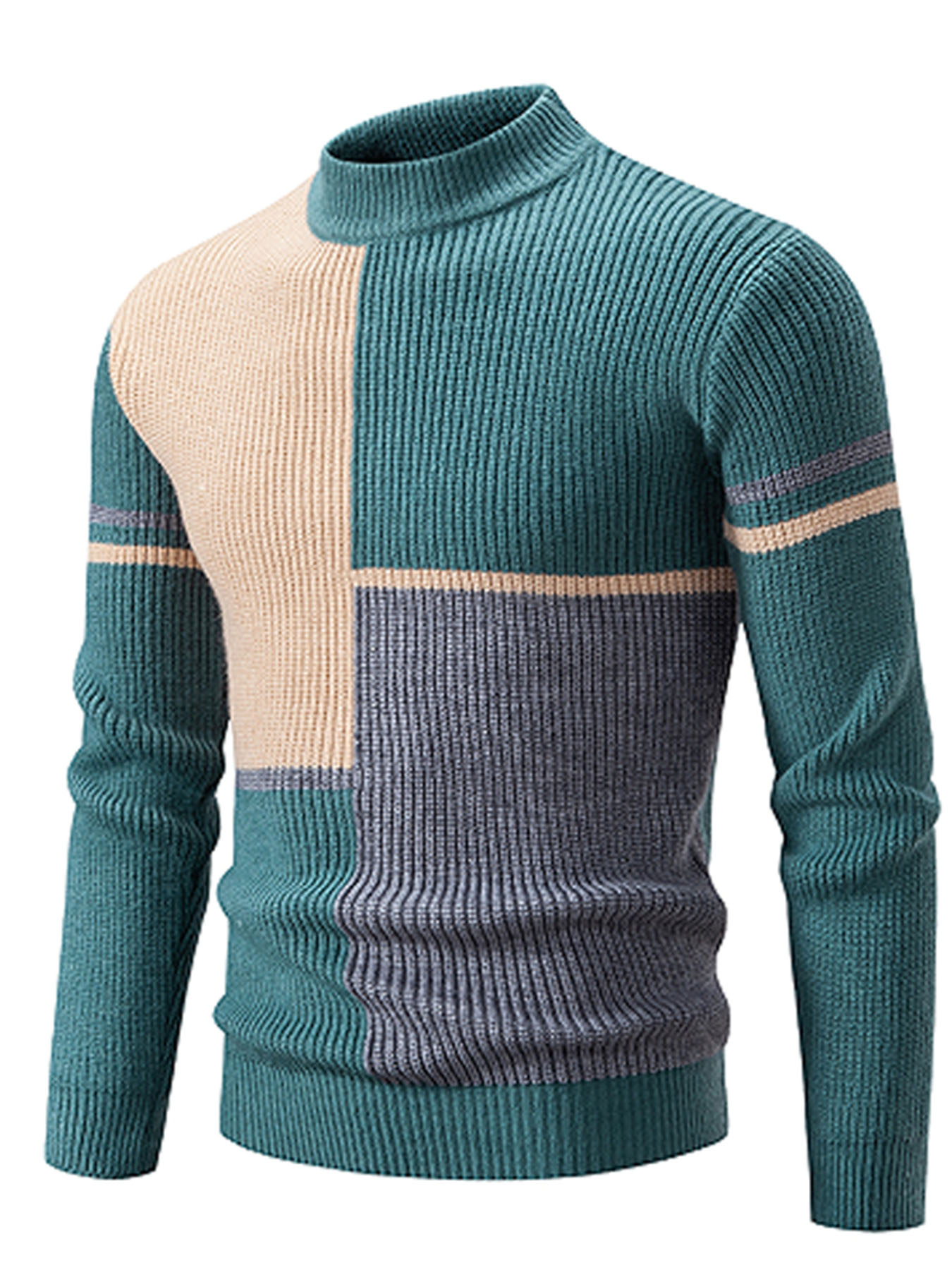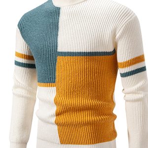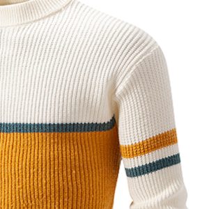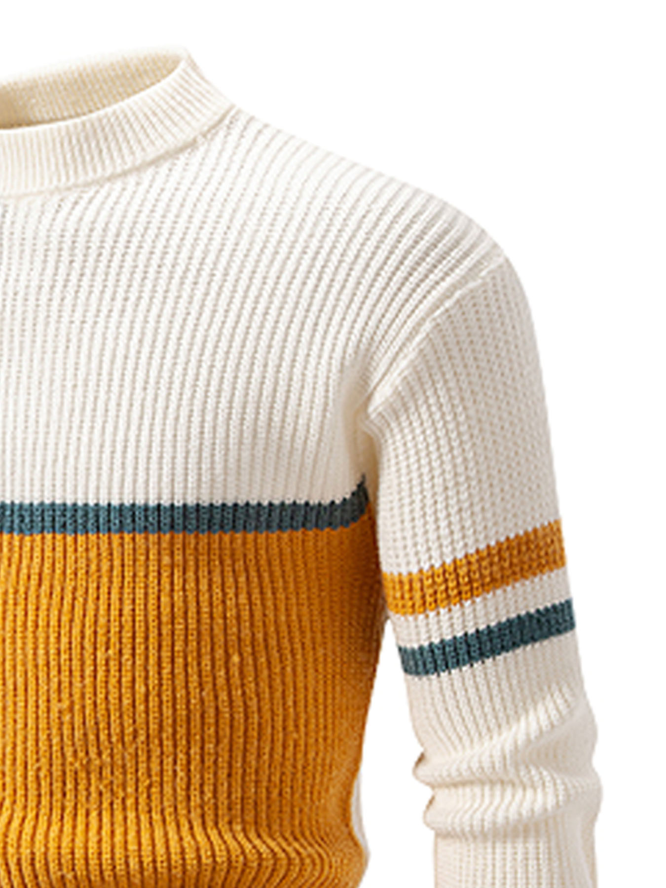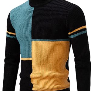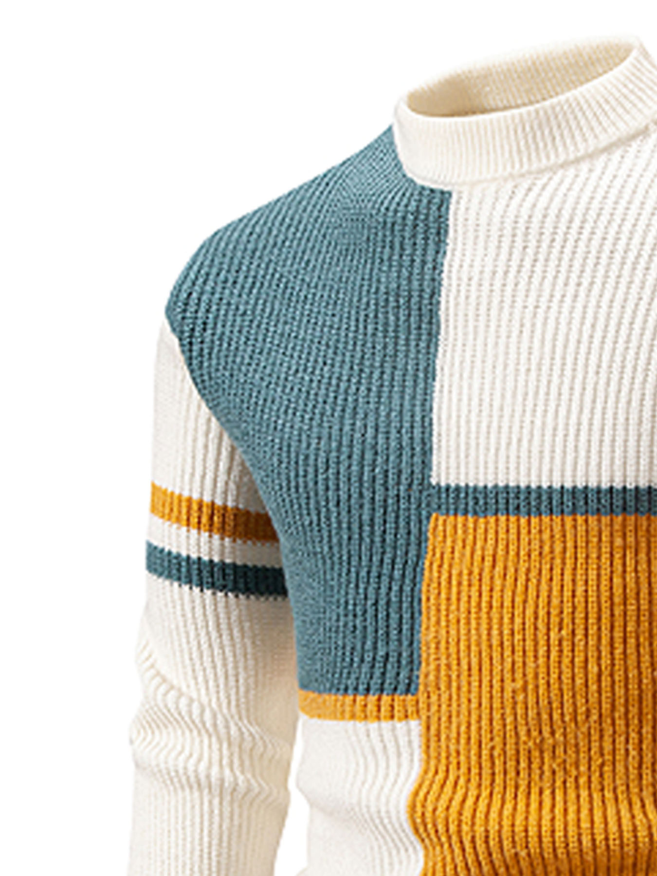 Men’S Autumn Winter New Round Neck Sweater | Color Block Design, Casual Versatile Top, Crew Neck, Acrylic Fabric, Slight Stretch