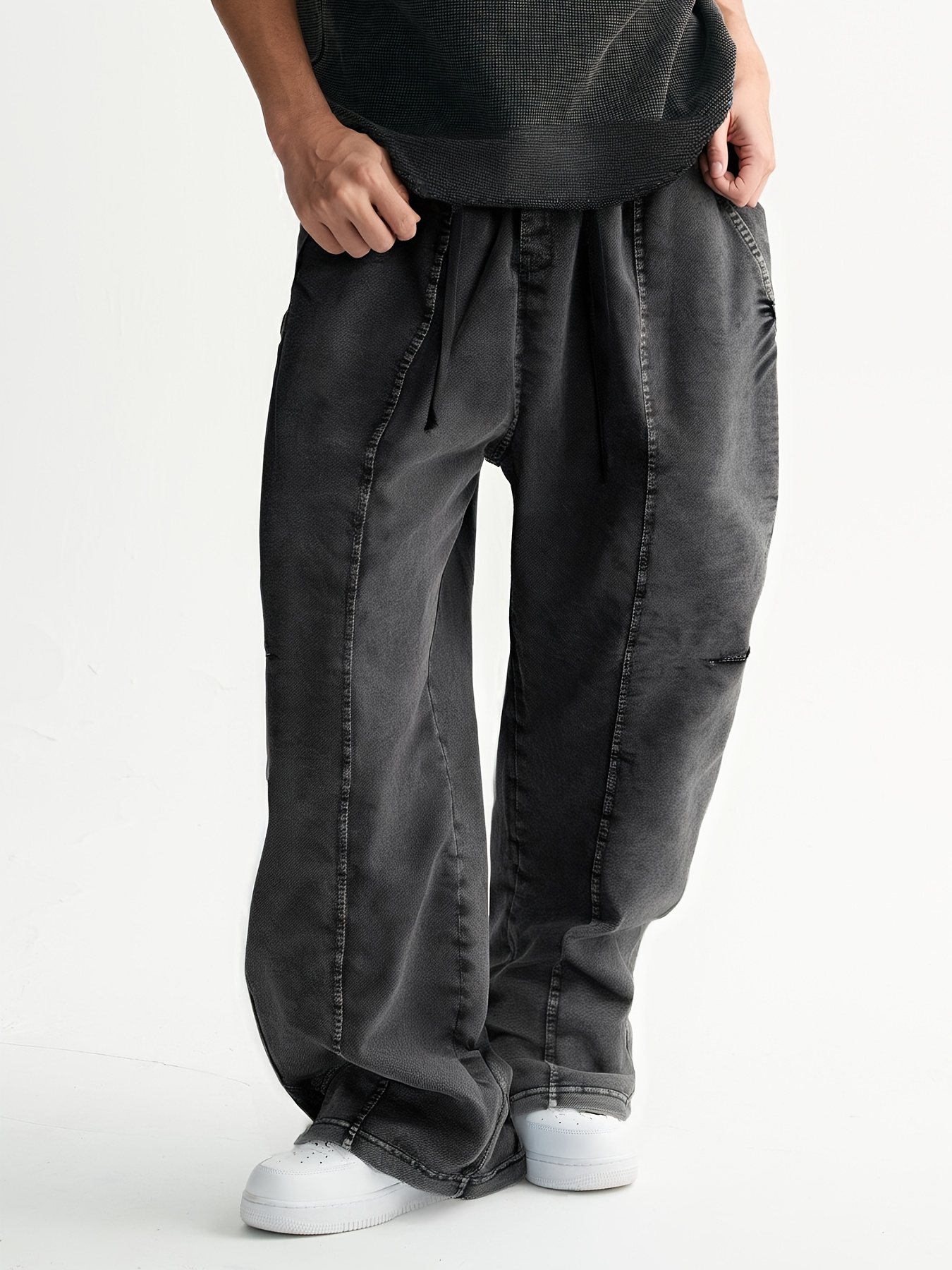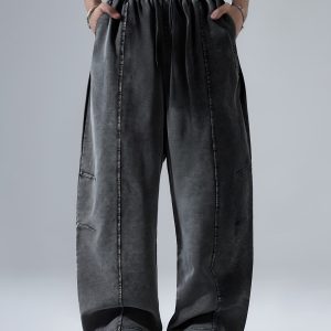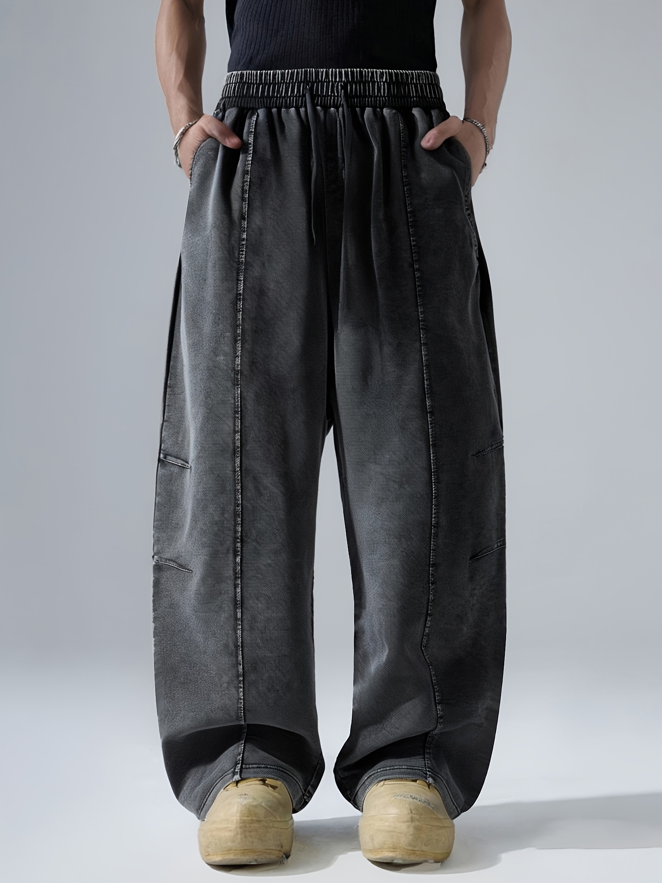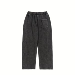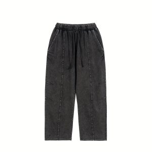 Men’S Baggy Fit Curved Sweatpants Made from 100%, Perfect for Autumn Outdoor Casual Wear. These Long Trousers Feature a Vintage Acid-Washed Look And Sewn Patchwork, Showcasing a Unique Hip-Hop Streetwear Design with a Drawstring