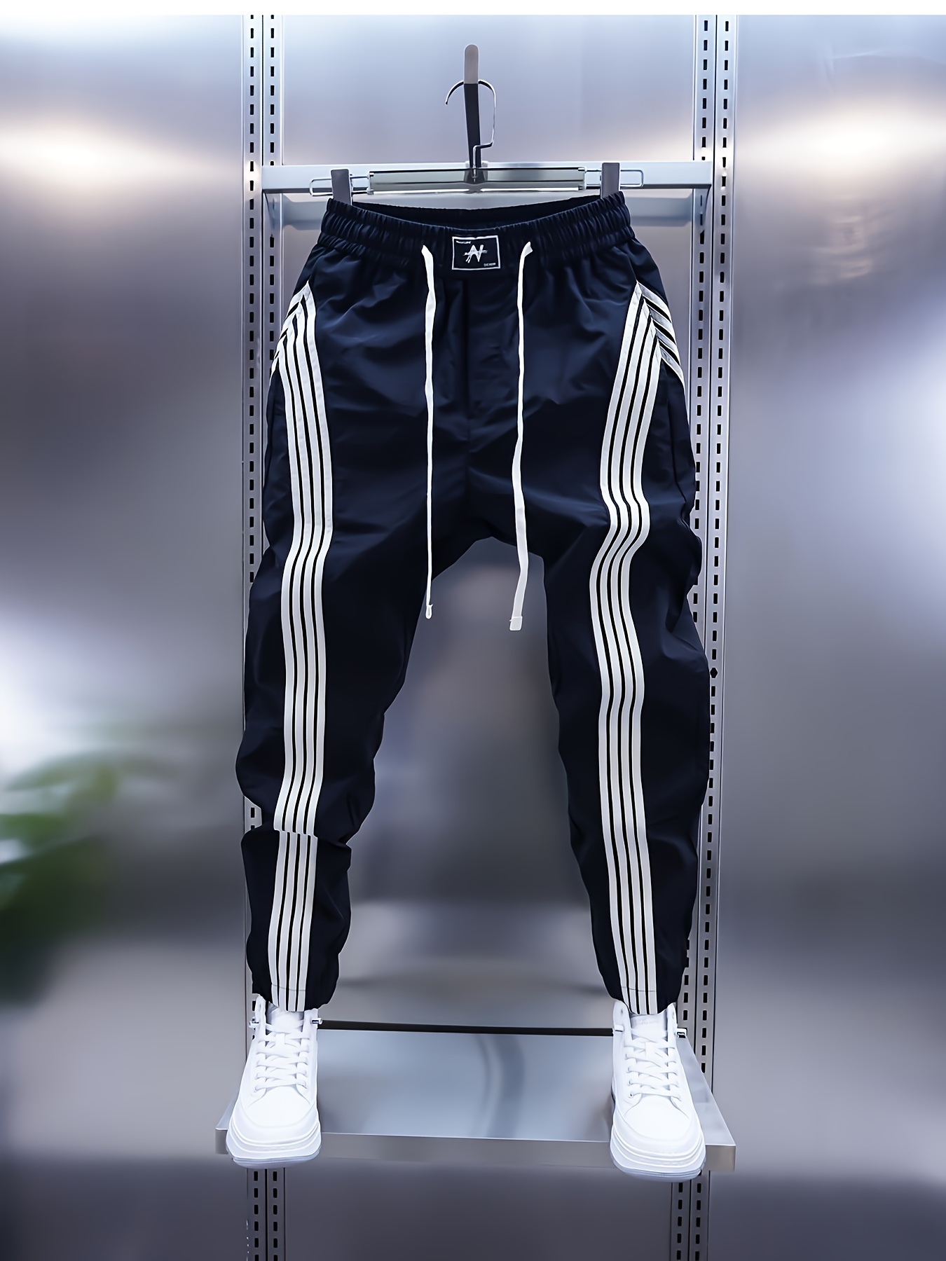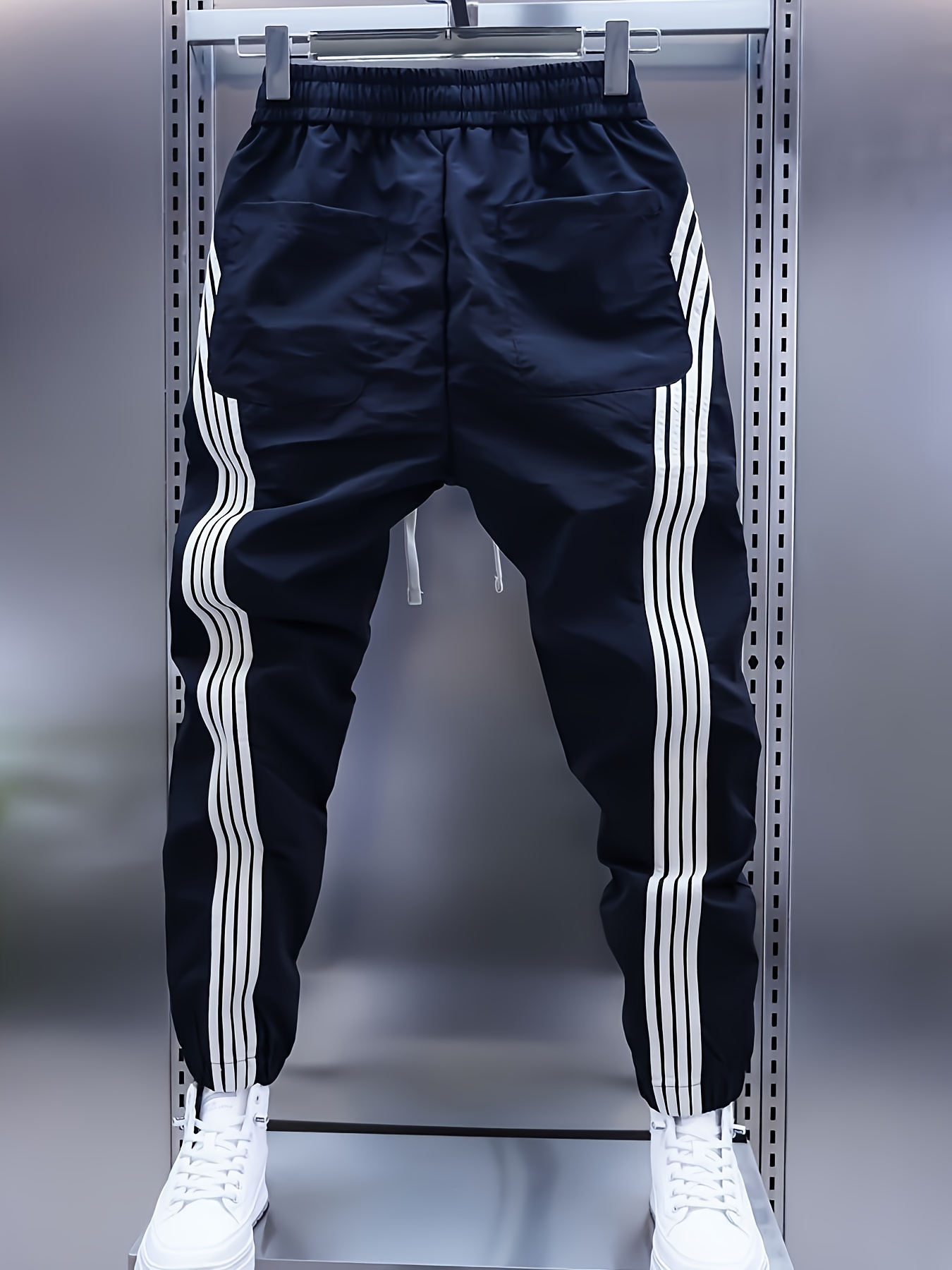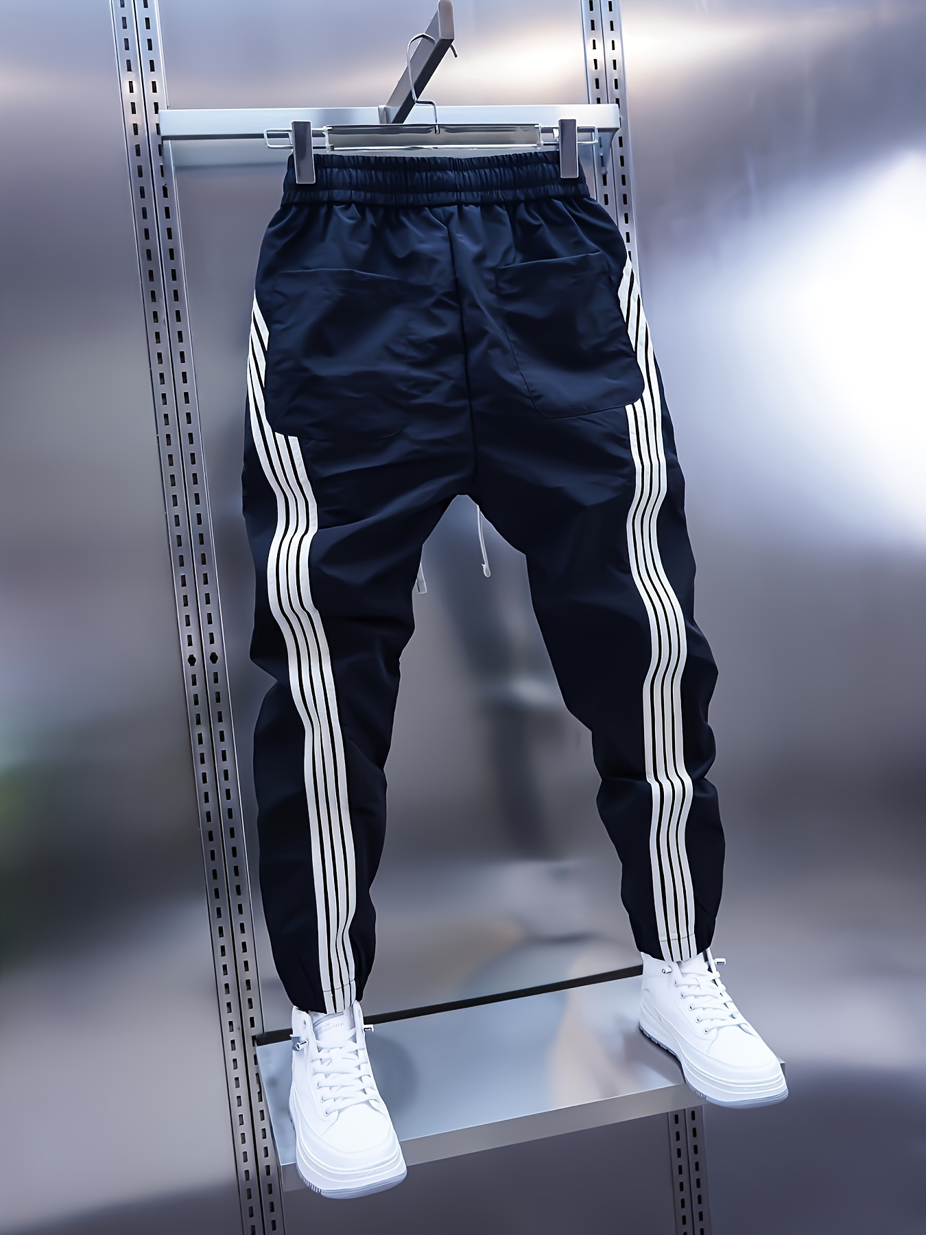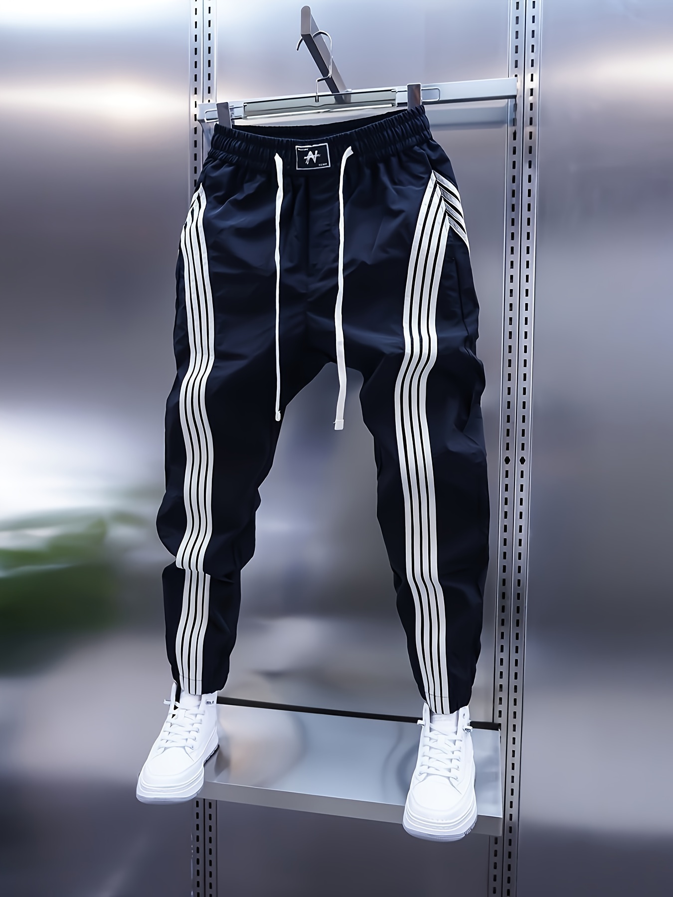 Men’S Casual Pants, Black Striped Long Trousers, Four-Stripe Tapered Pants, Solid Color Elastic Waist Joggers, Slim-Fit Versatile Ankle Pants, Trendy Black Long Pants for Halloween