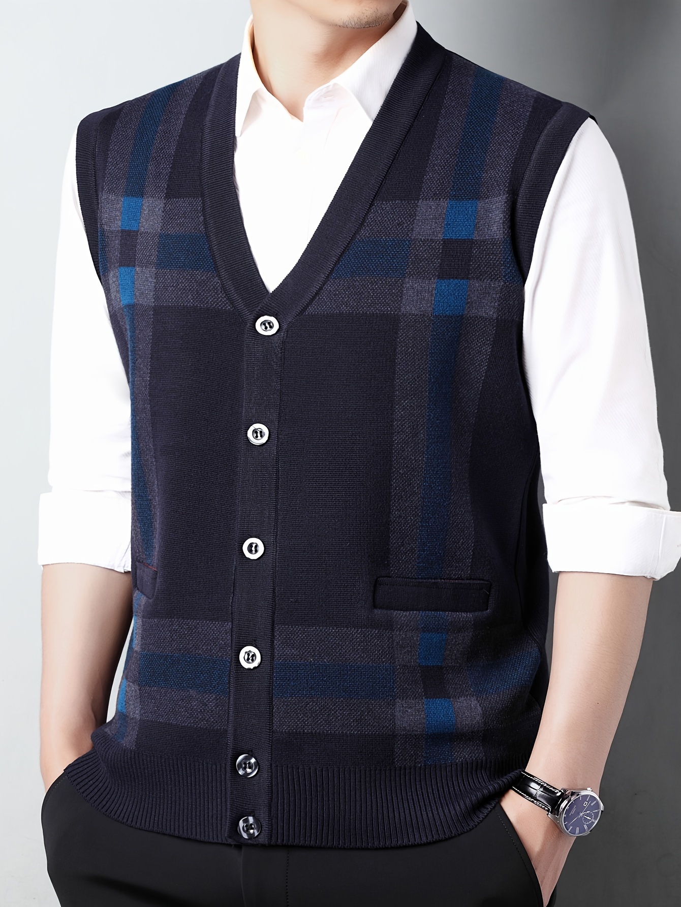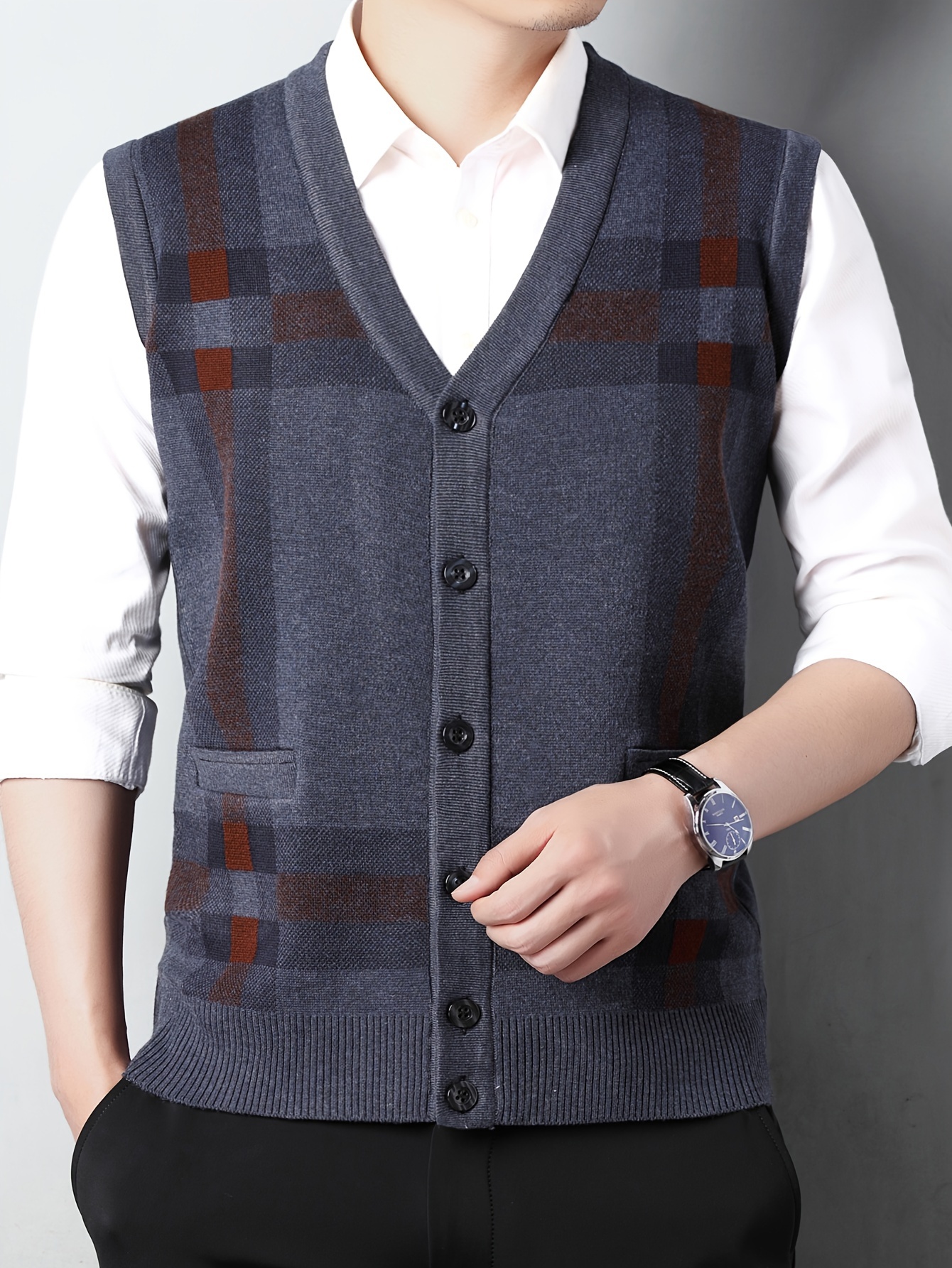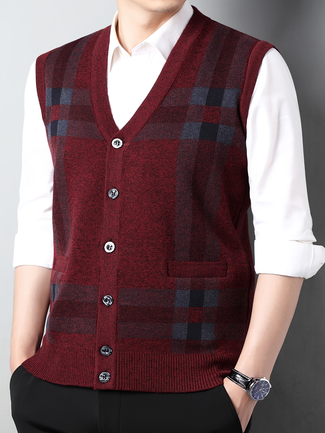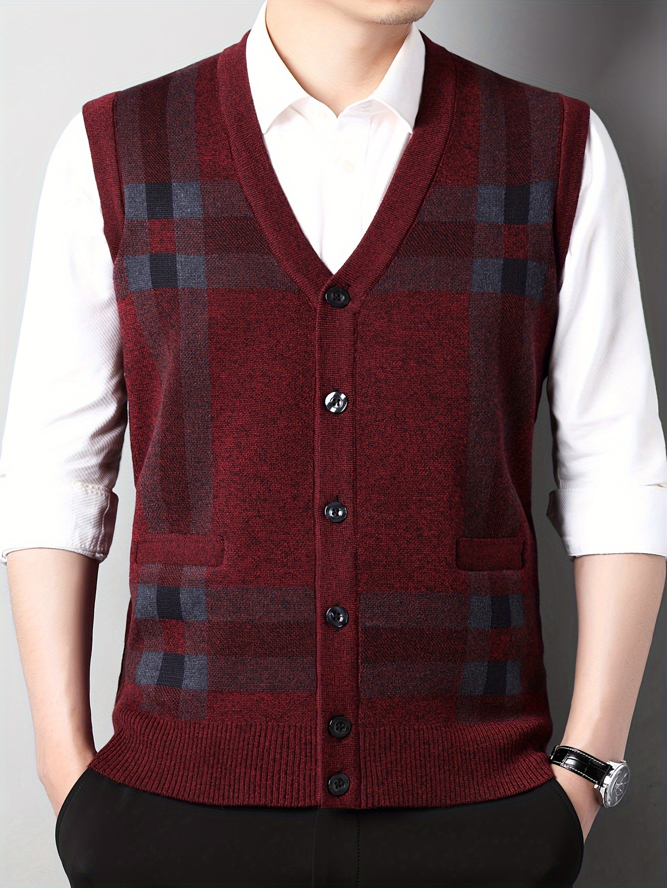 Men’s Classic Geometric Plaid Knit Sleeveless Vest – V-Neck Button Front, Asymmetrical Design, 100% Polyester Warmth for Fall Winter, Casual Layering Essential, Winter Warm Vest, Easycare Fabric