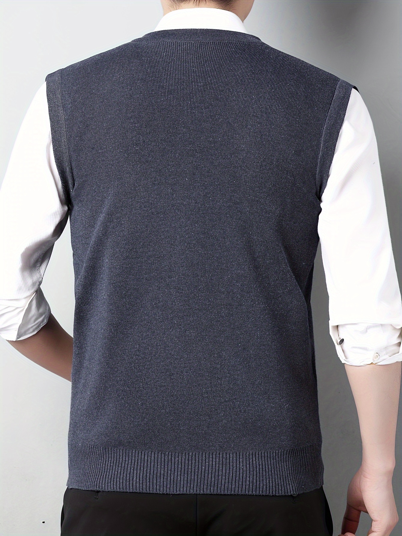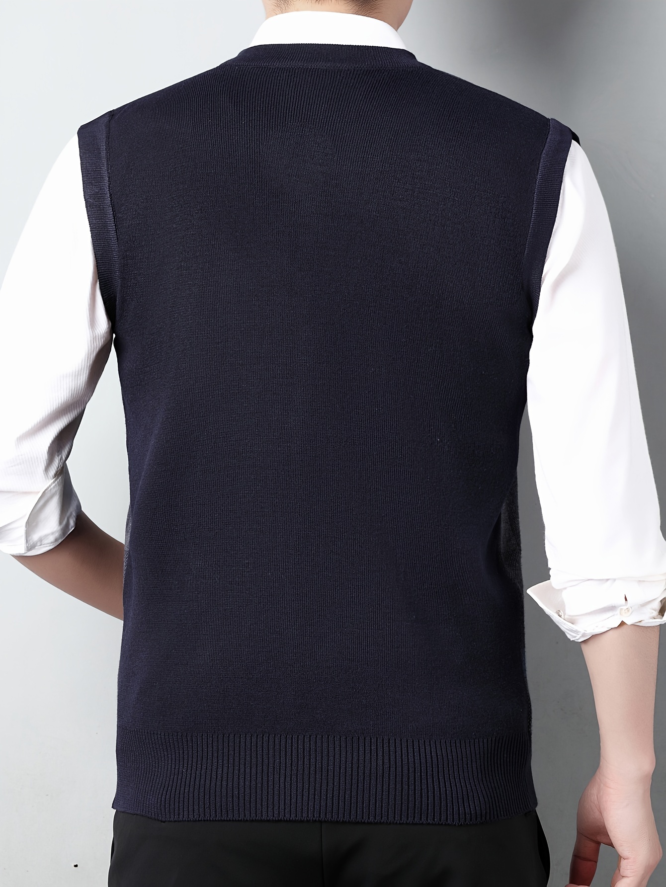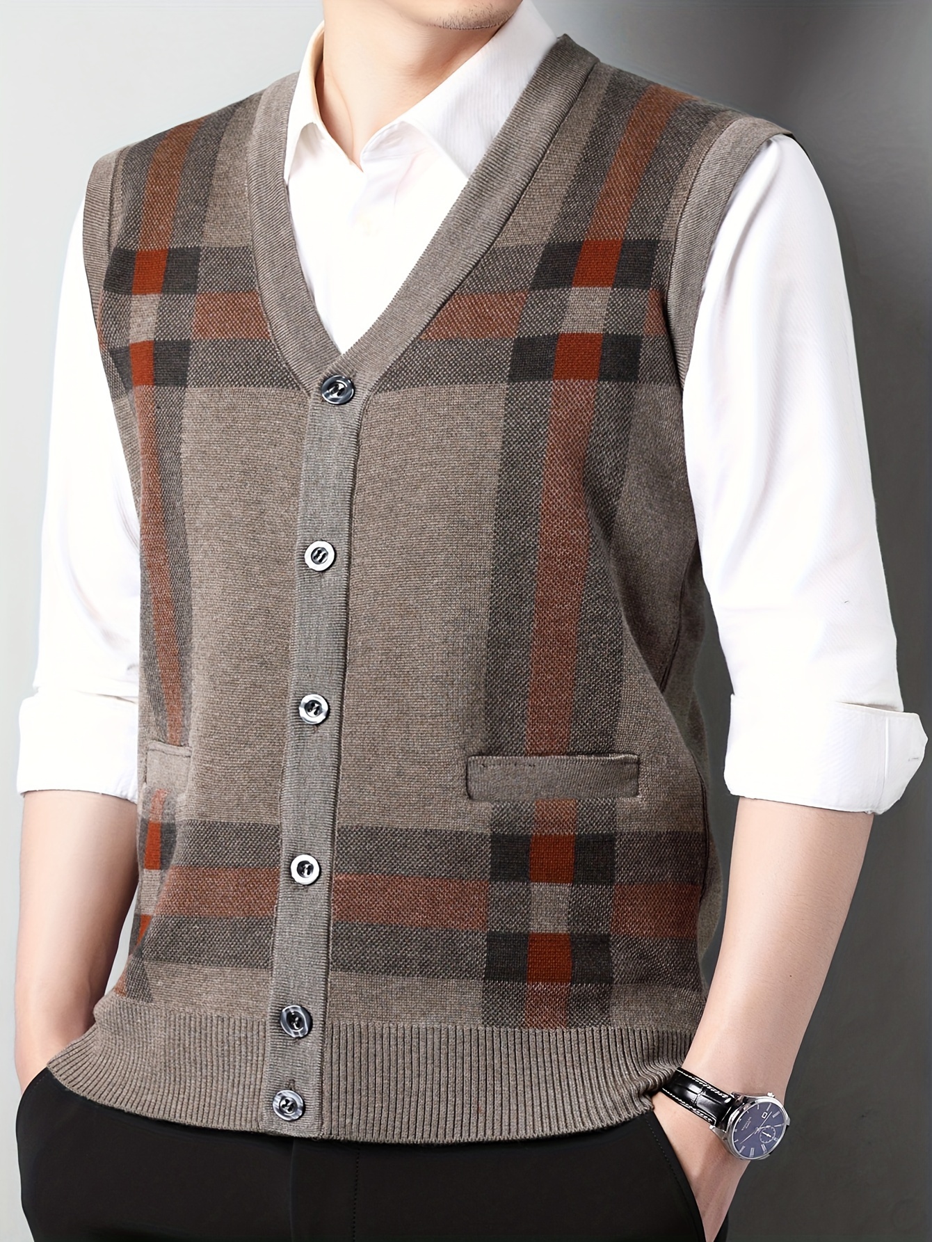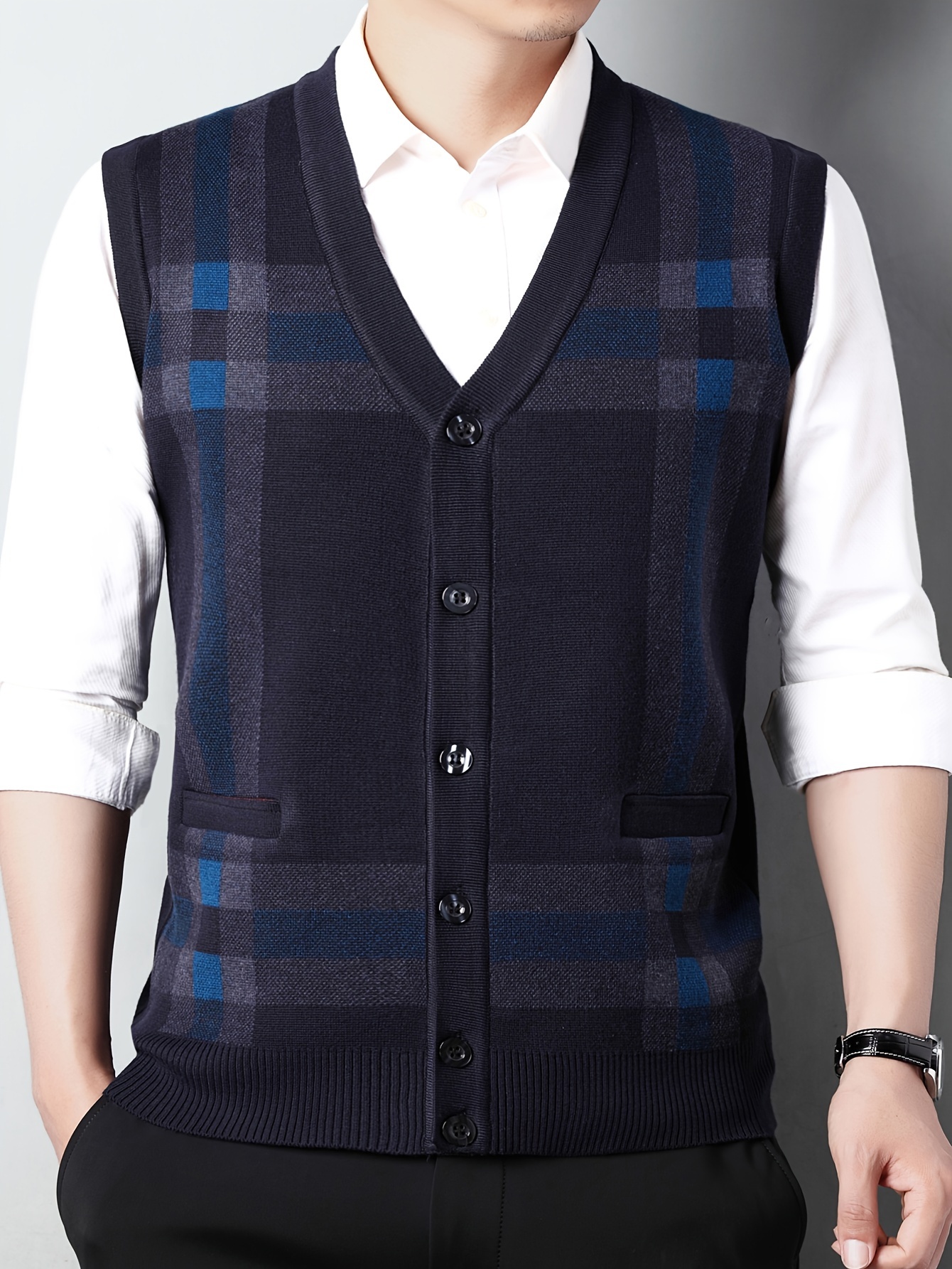 Men’s Classic Geometric Plaid Knit Sleeveless Vest – V-Neck Button Front, Asymmetrical Design, 100% Polyester Warmth for Fall Winter, Casual Layering Essential, Winter Warm Vest, Easycare Fabric