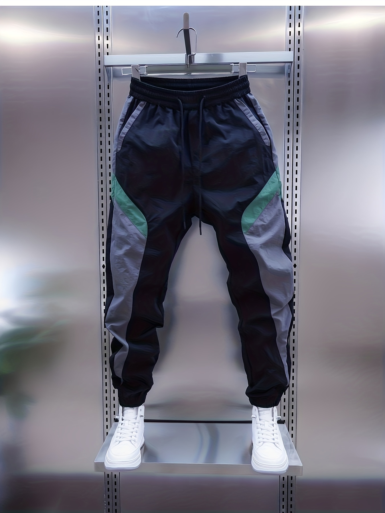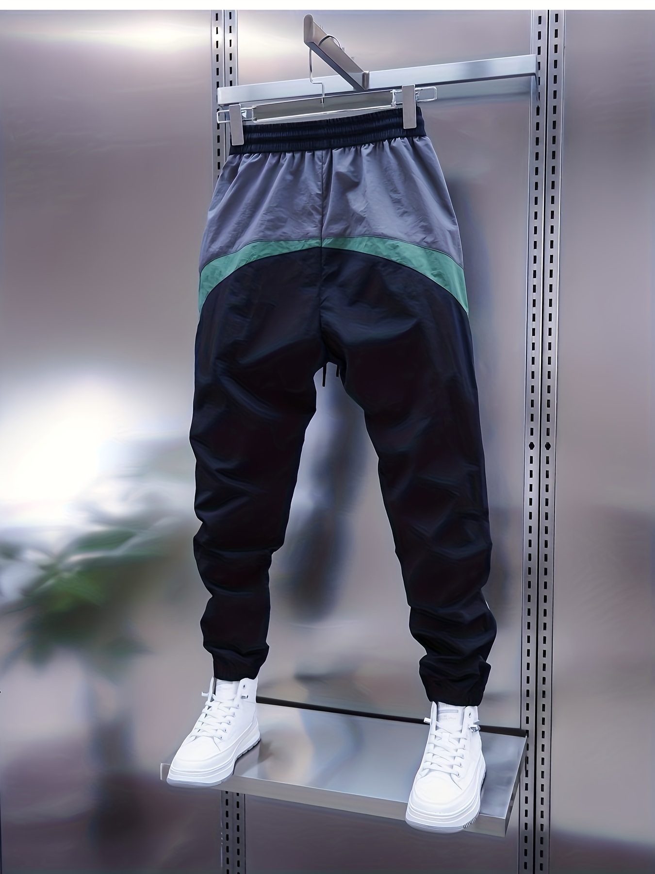 Men’s Long Pants Casual Trousers with Drawstring Elastic Waist, Black, Green, Gray Color Block Design, Trendy Street Sport Style, Comfortable and Adjustable, Pair with White Casual Shoes for Daily and Sports Wear
