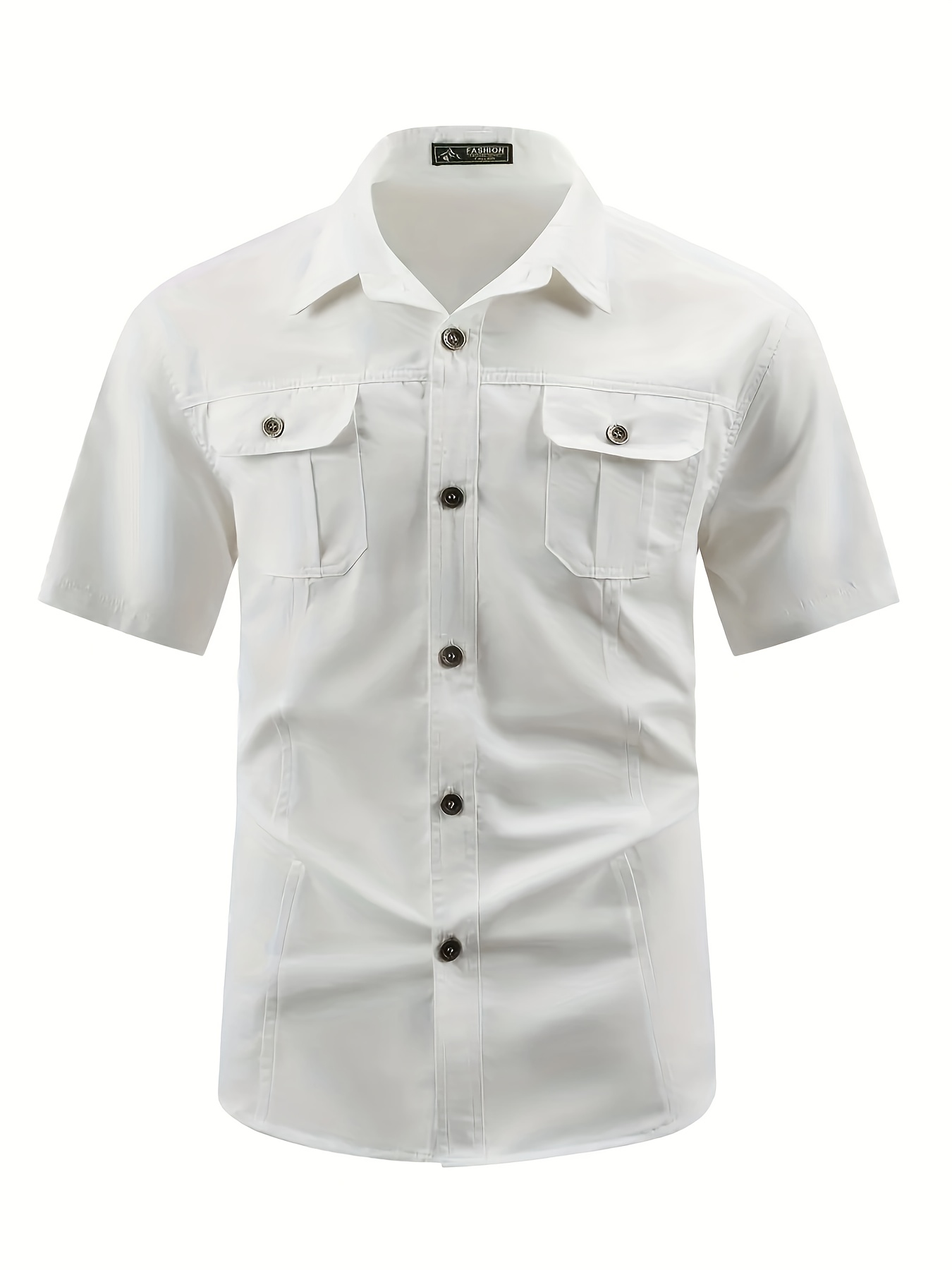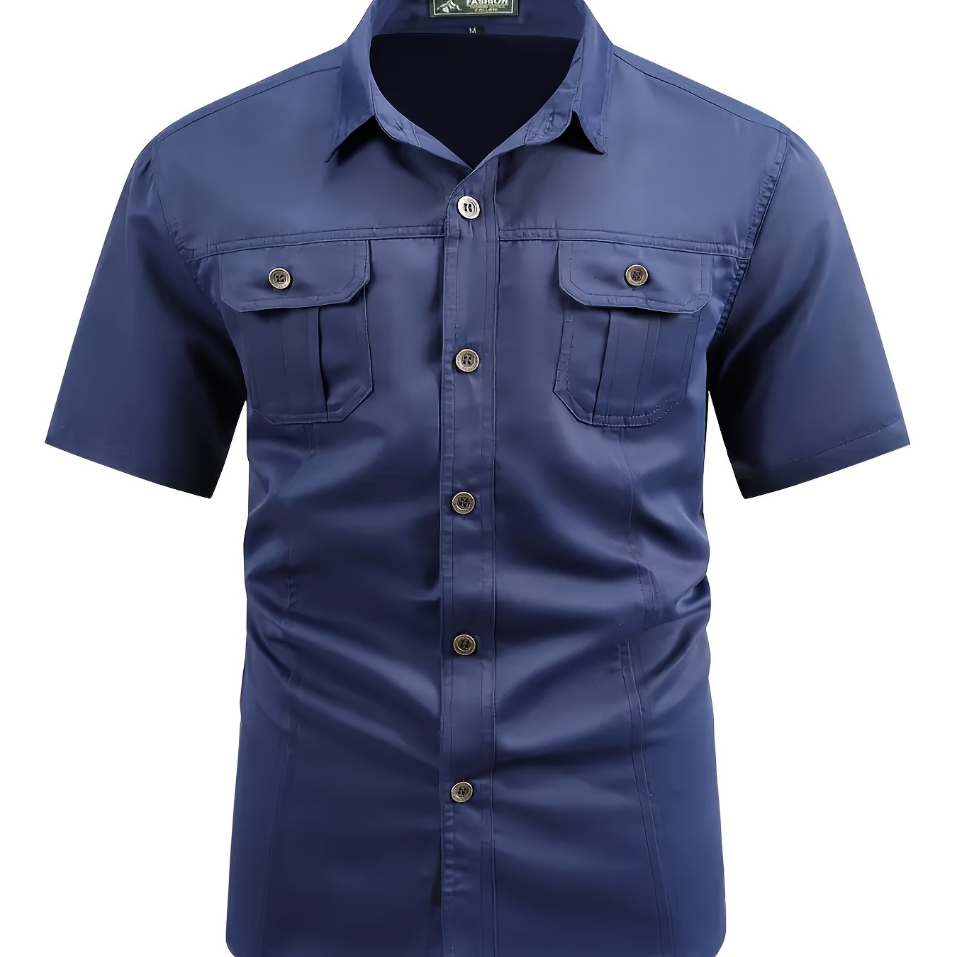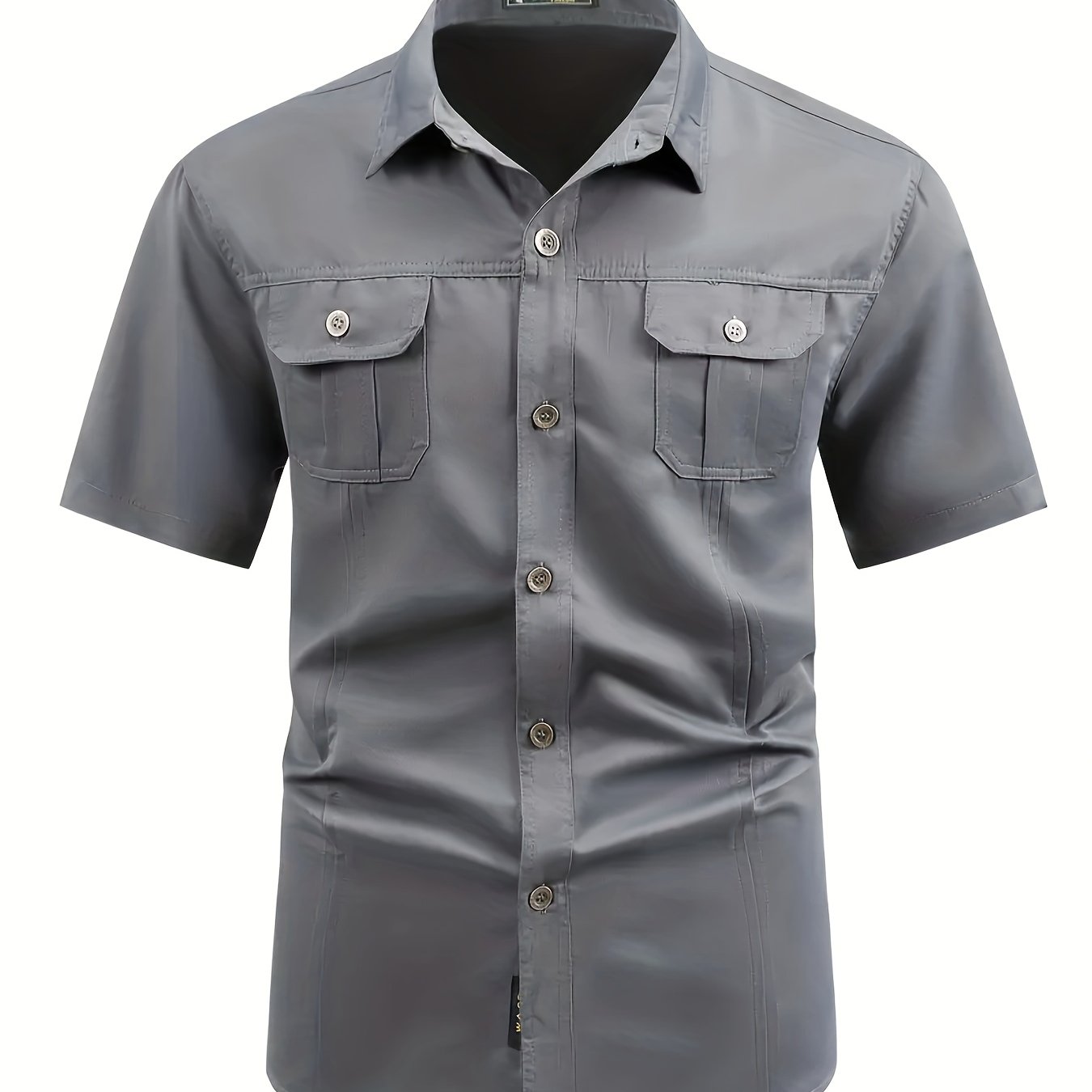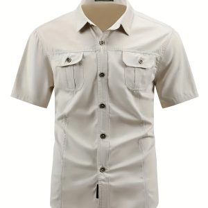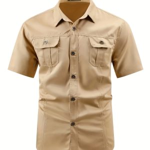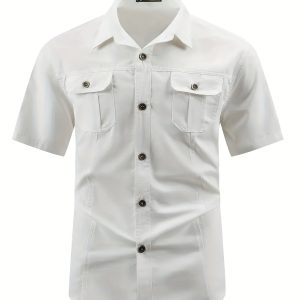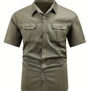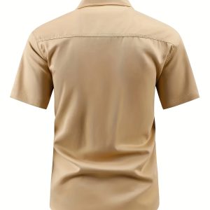 Men’S Solid Color Short-Sleeve Work Shirt Jacket with Button Pockets for Casual Outdoor Wear