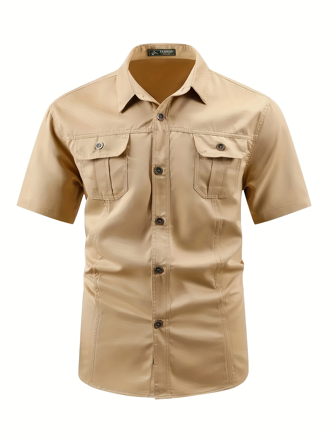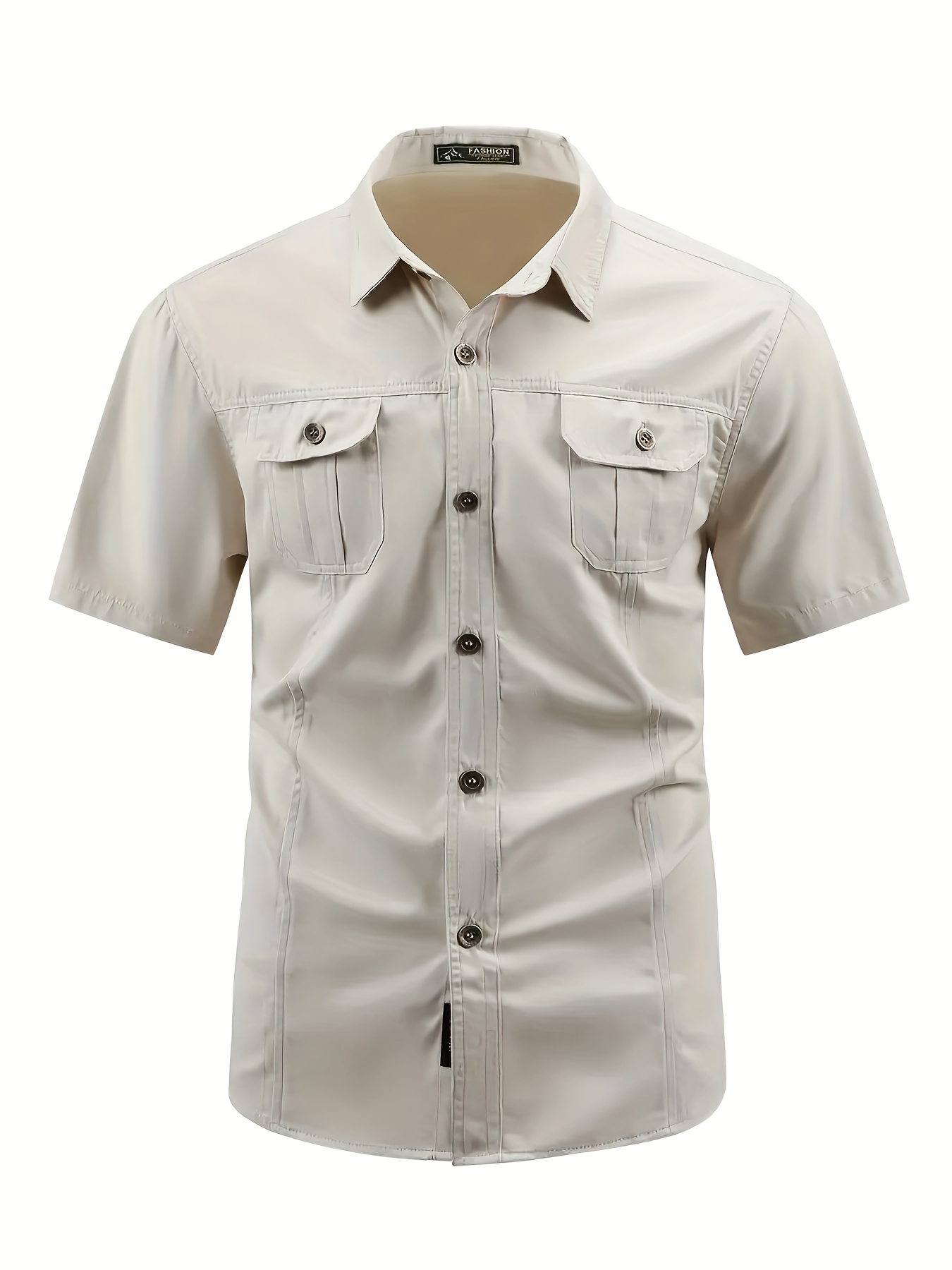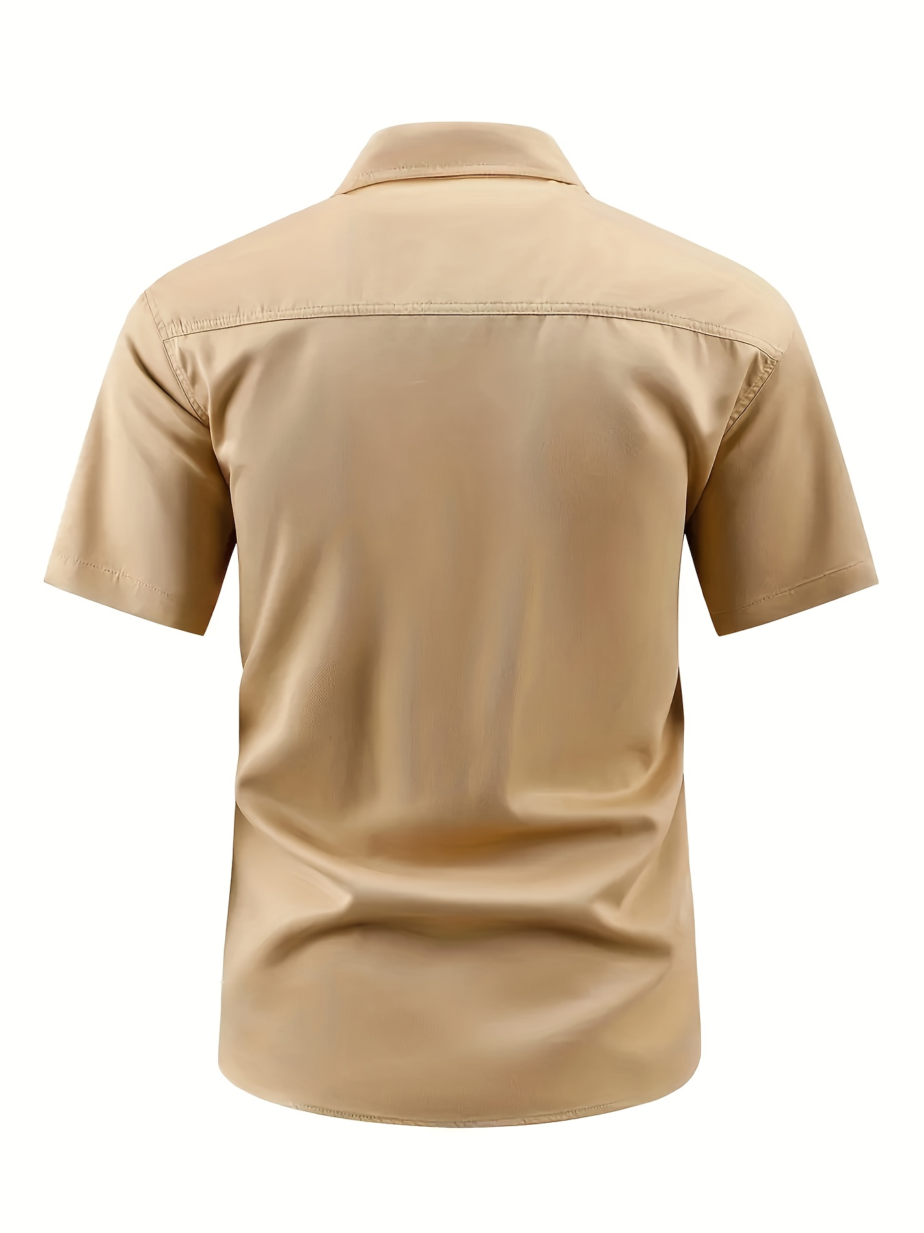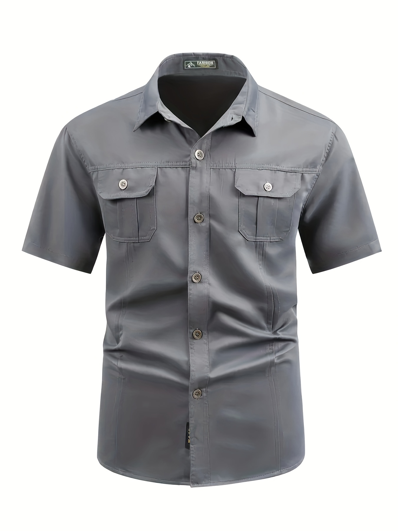 Men’S Solid Color Short-Sleeve Work Shirt Jacket with Button Pockets for Casual Outdoor Wear