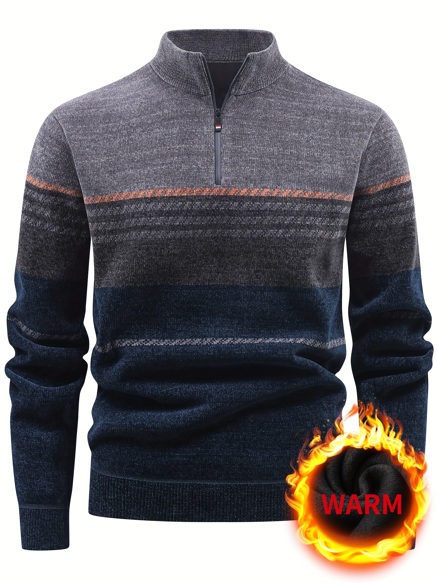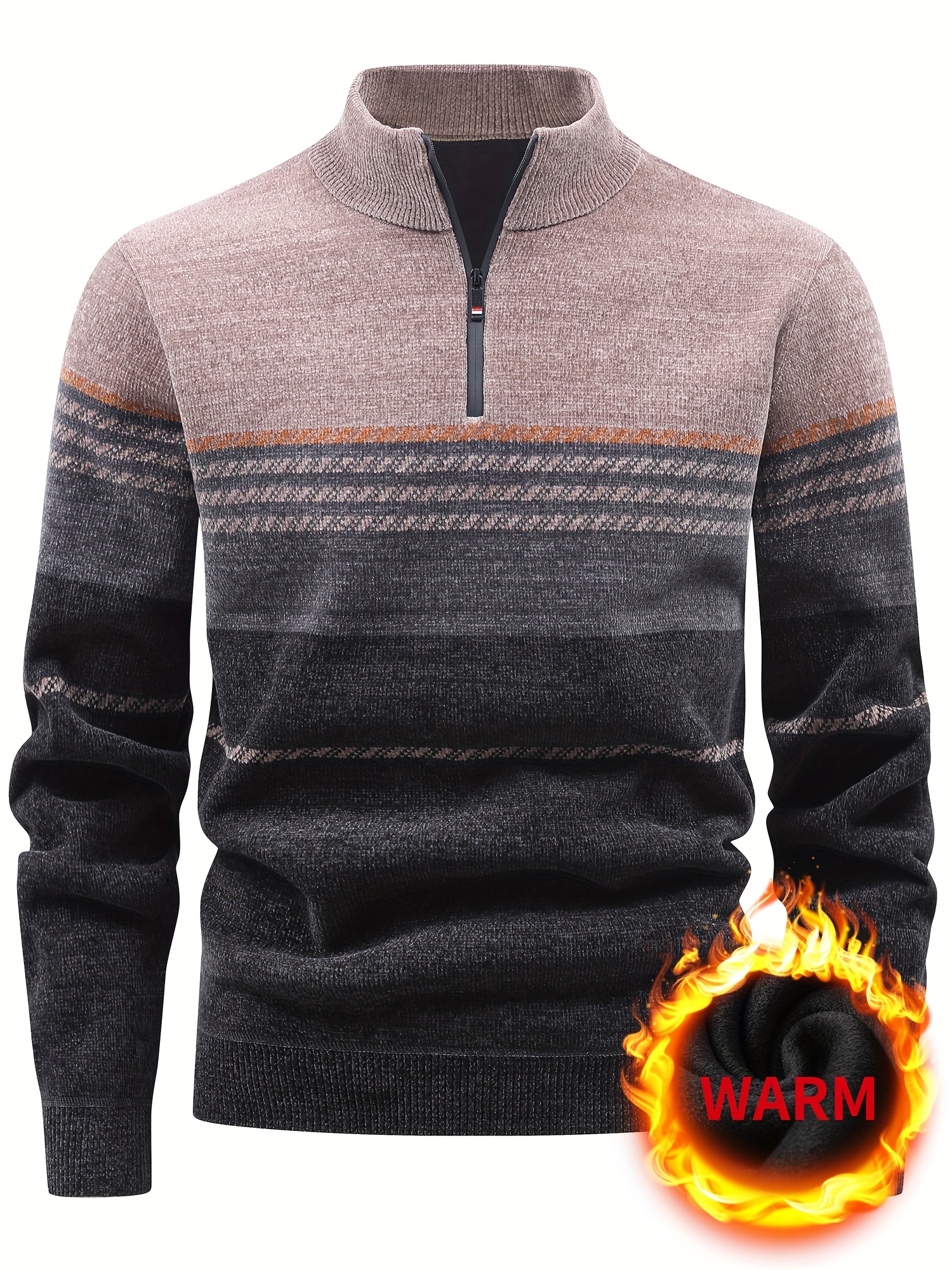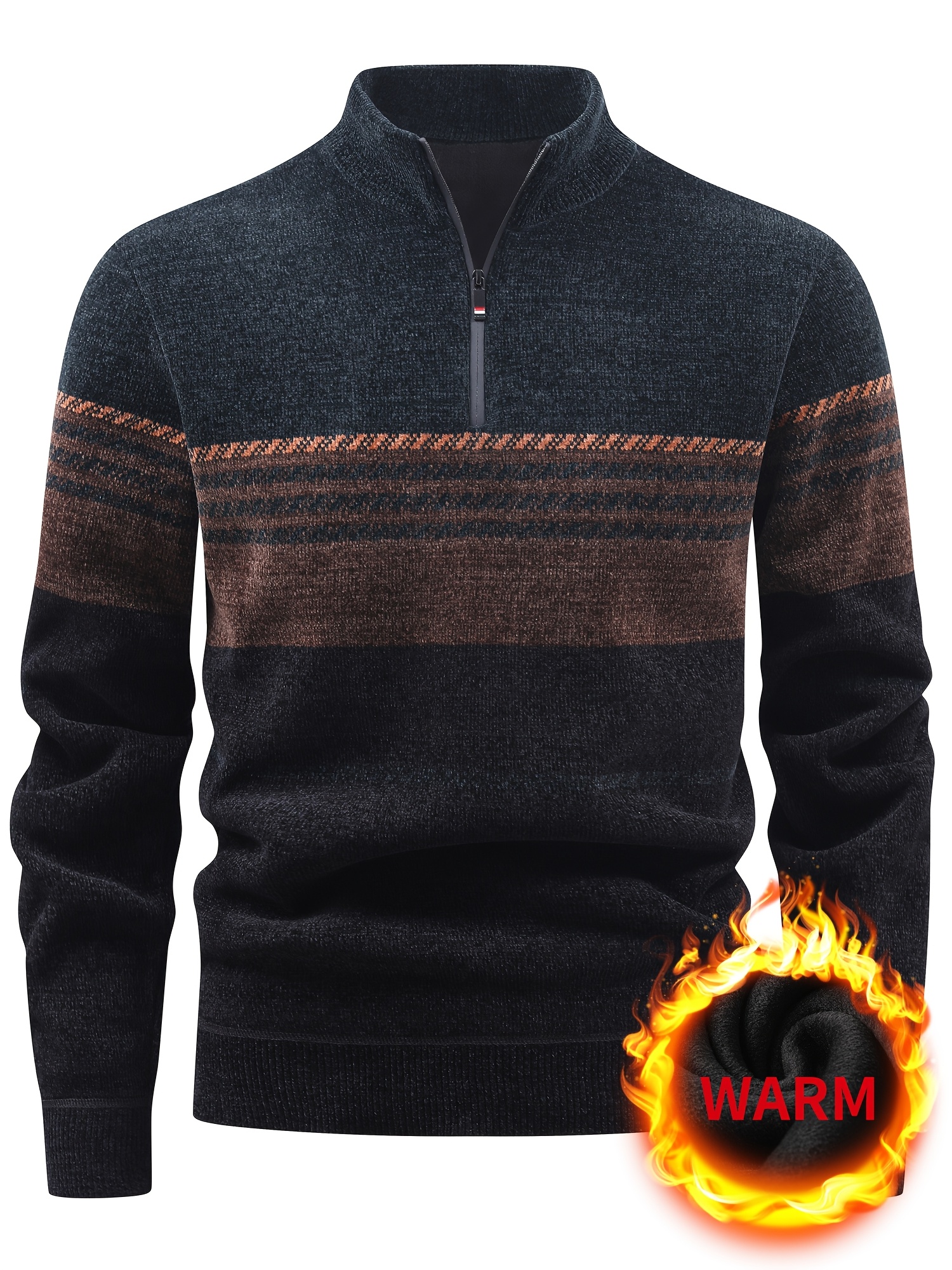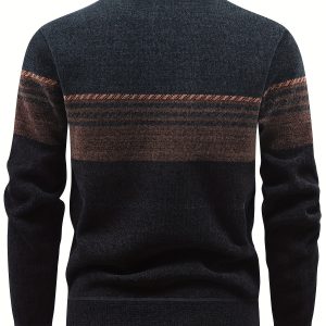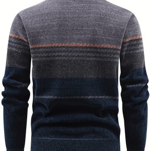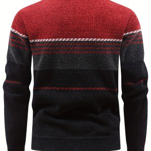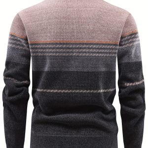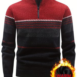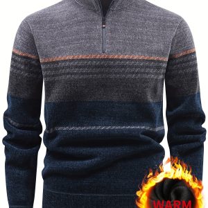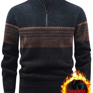 Men’S Winter Knitted Pullover with a Warm Fleece-Lined Zip Collar, Featuring Contrasting Stripes, Perfect for Casual Outings.