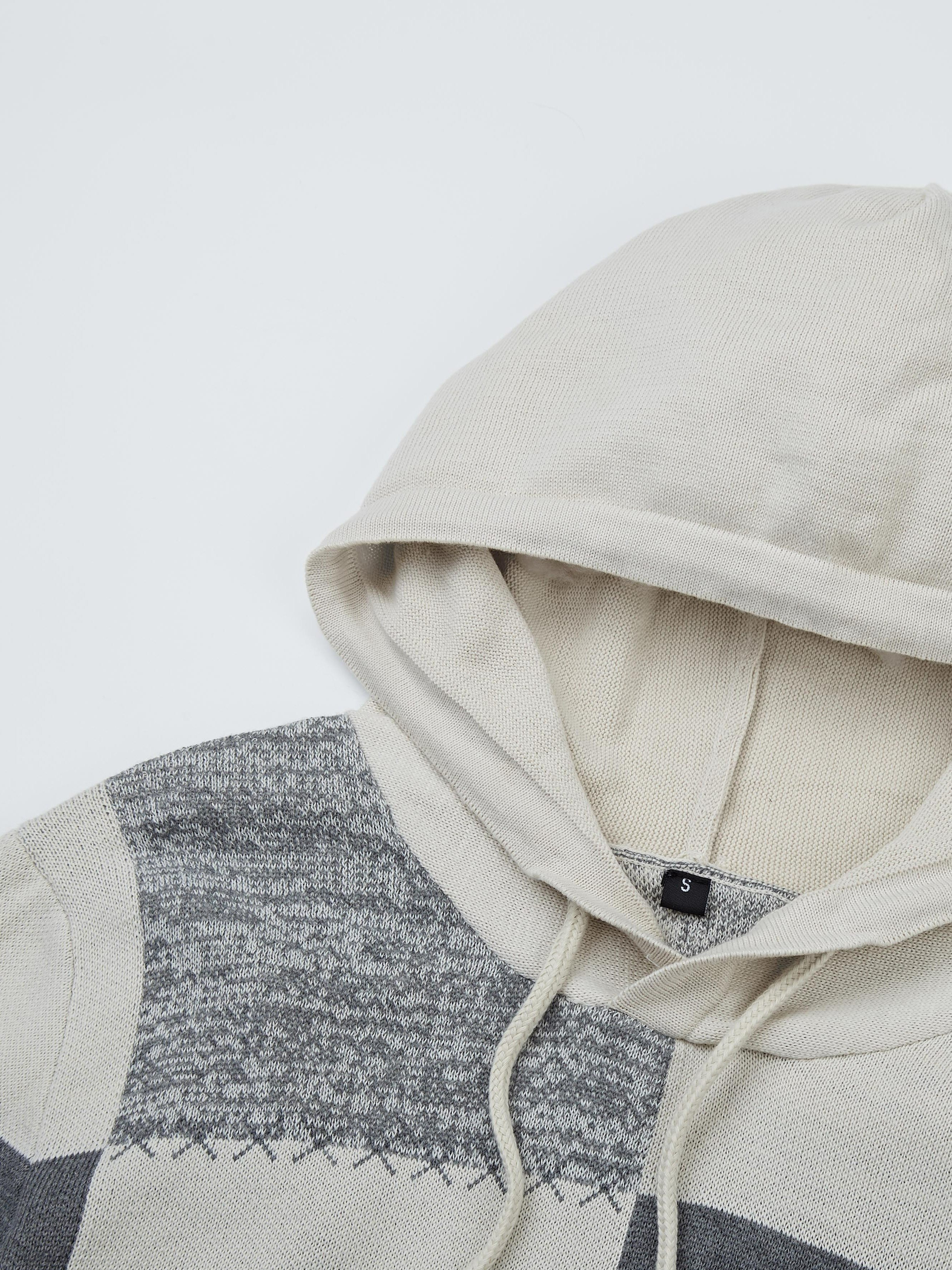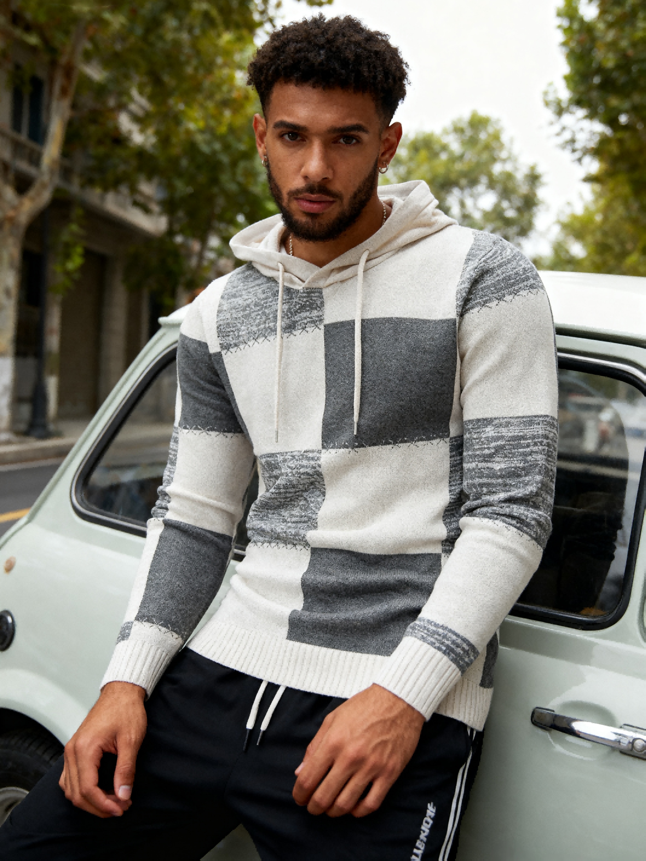 Men’s Winter Warm Plaid Patchwork Sweater – Slim Fit Color Block Hooded Pullover with Patchwork Design, Machine Washable Cold Weather Sweaters for Outdoor Sports & Casual Wear (Autumnu002FWinter)