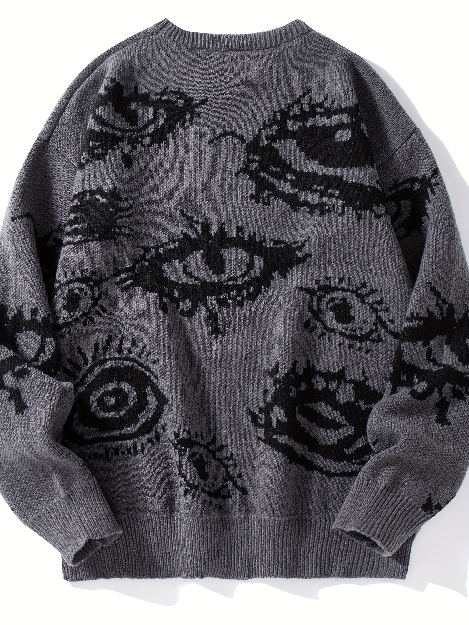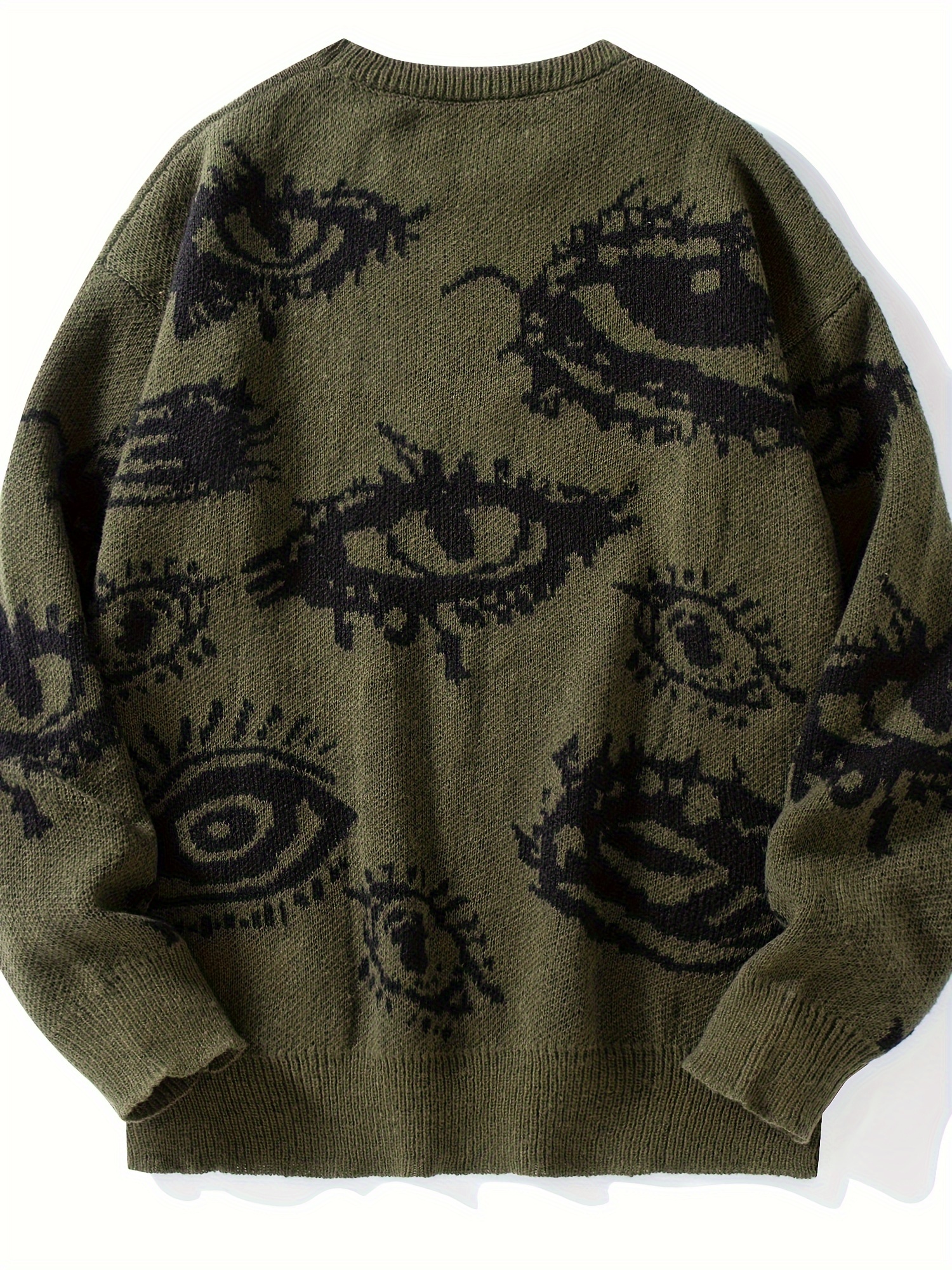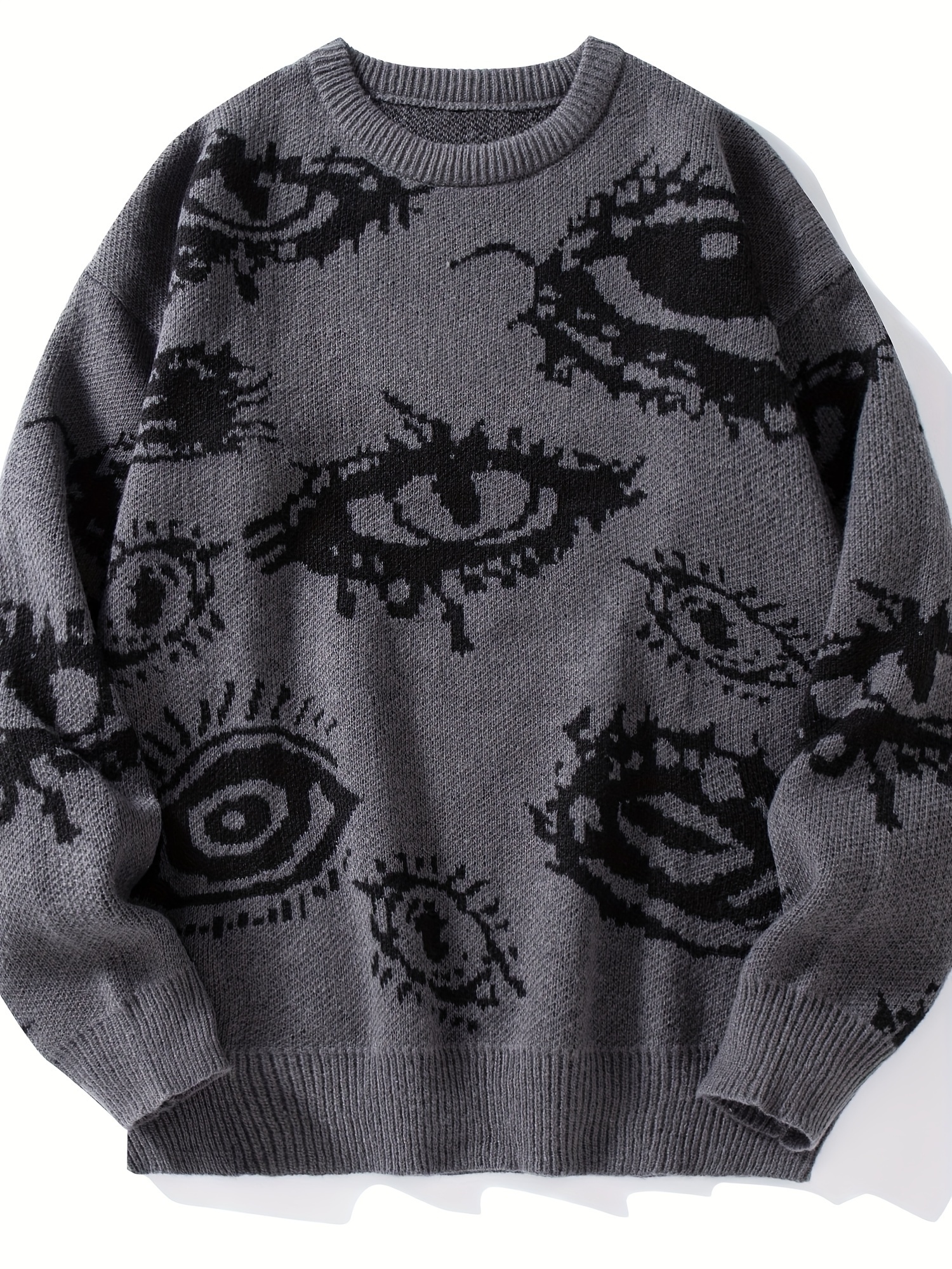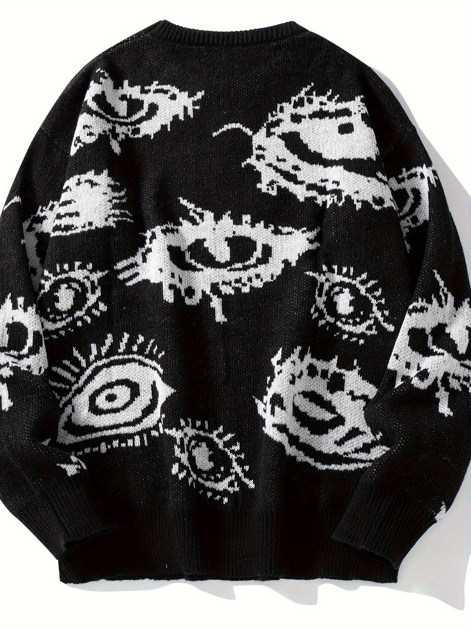 Winter Warm Knit Sweater – Loose Fit Stretchable Long Sleeve Round Neck Casual Pullover with Eye-Catching ‘eyes’ (eyebrowu002Feye Patch) Design, Solid Color Base for -casual & Weather, Non- (Hand Washu002FDry)