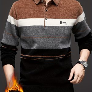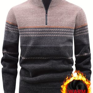 Men’S Winter Knitted Pullover with a Warm Fleece-Lined Zip Collar, Featuring Contrasting Stripes, Perfect for Casual Outings.