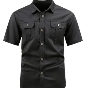 Men’S Solid Color Short-Sleeve Work Shirt Jacket with Button Pockets for Casual Outdoor Wear